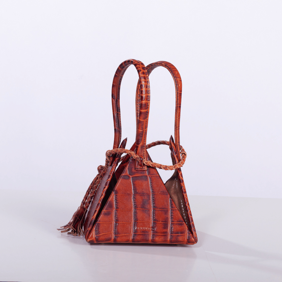 En cuir recyclé, il attire les regards par sa forme géométrique et son fermoir tressé à la main.