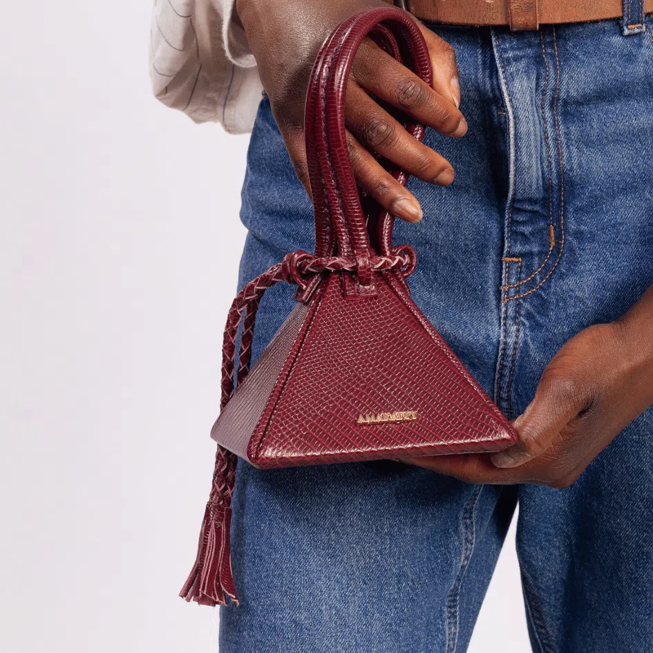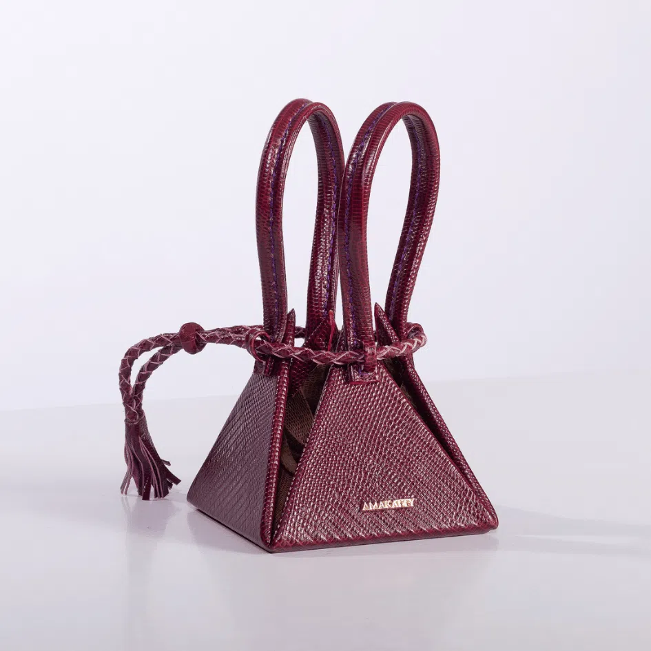 En cuir recyclé, il attire les regards par sa forme géométrique et son fermoir tressé à la main.