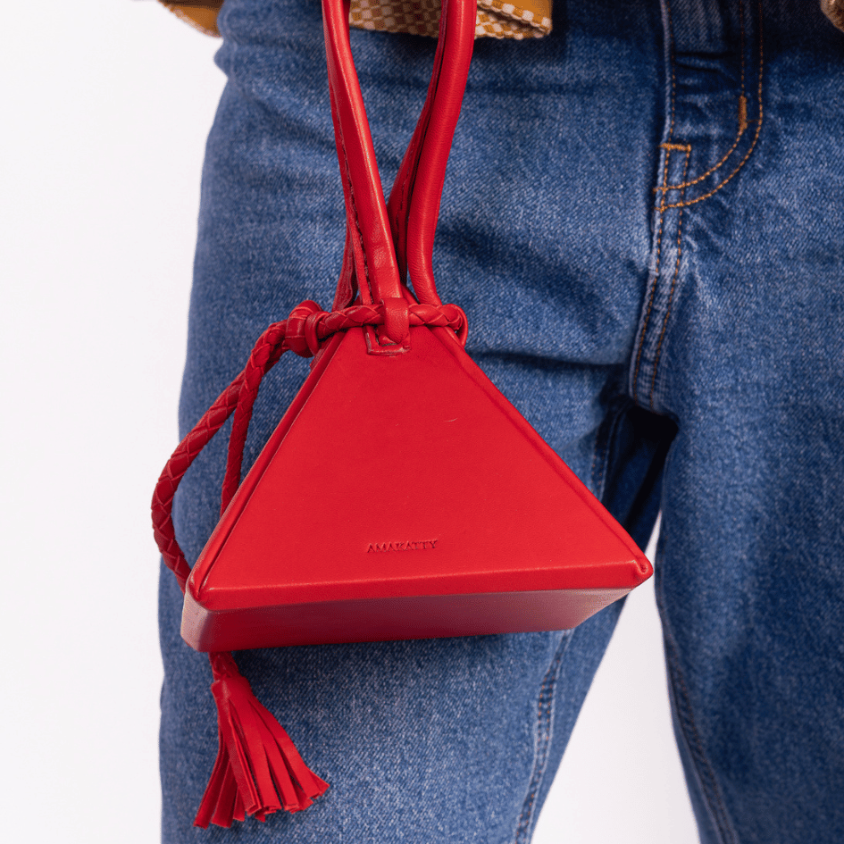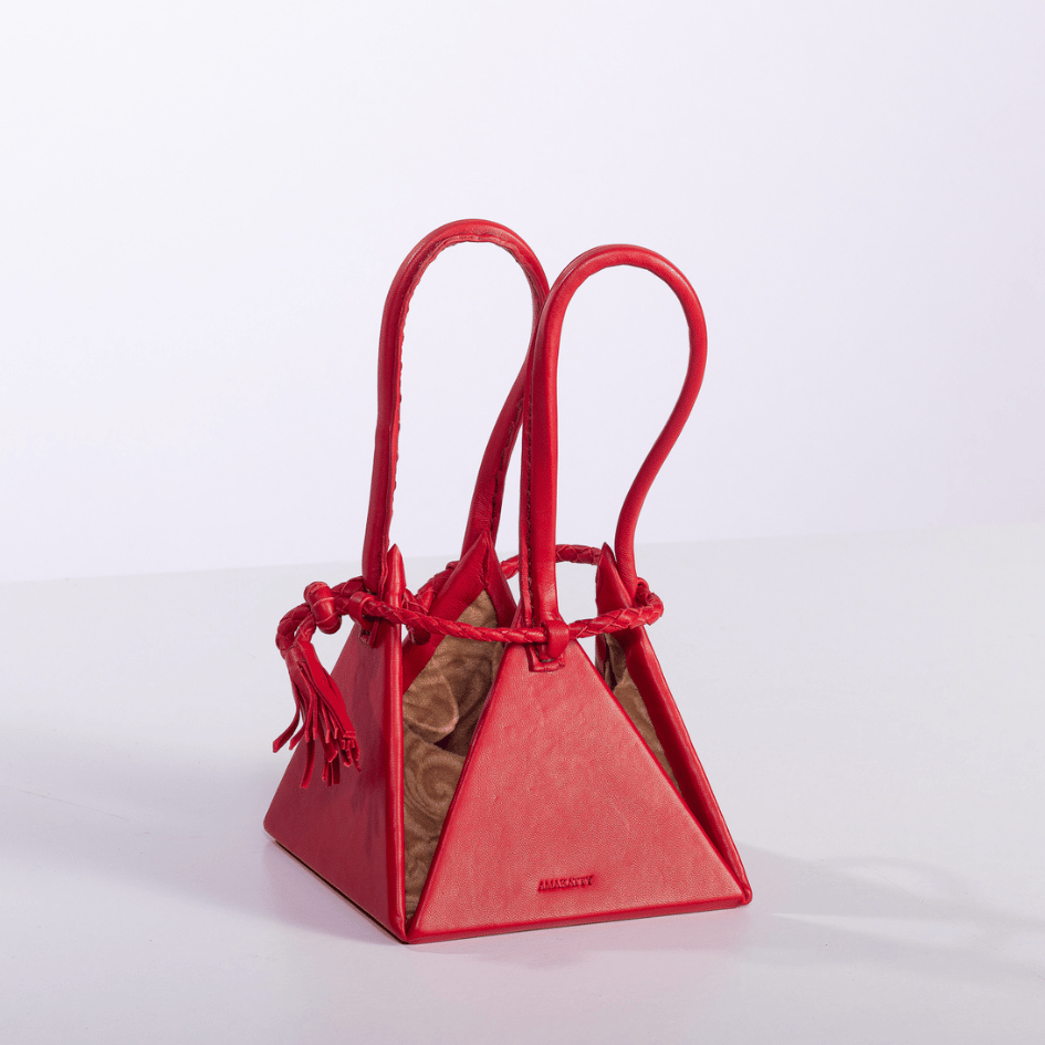 En cuir recyclé, il attire les regards par sa forme géométrique et son fermoir tressé à la main.