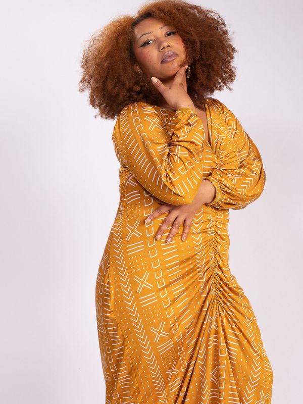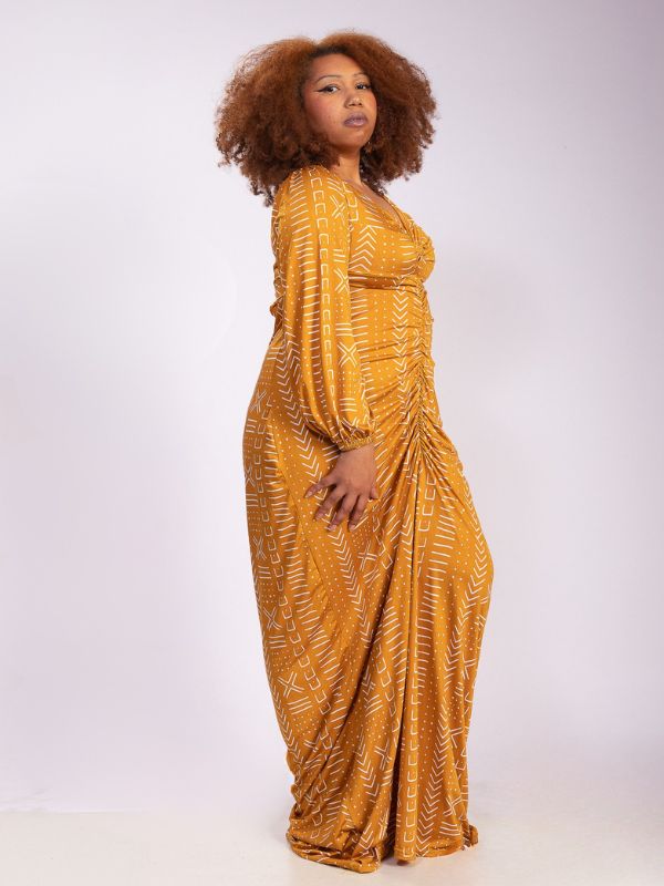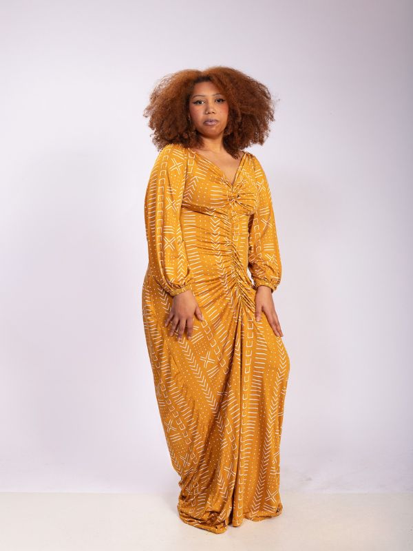 Sa coupe près du corps et ses fronces centrales créent une ligne verticale qui allonge la silhouette.