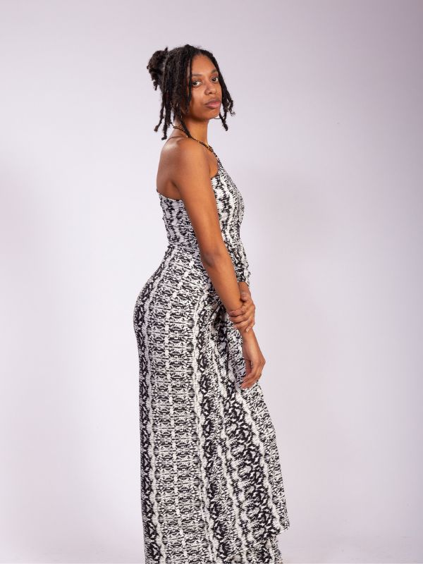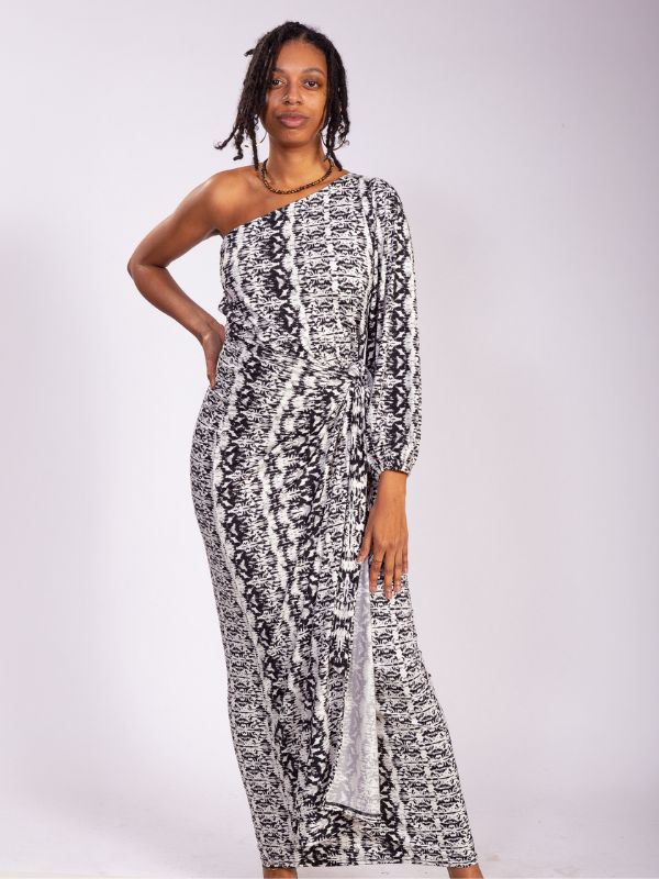Robe longue à coupe asymétrique et encolure décalée.