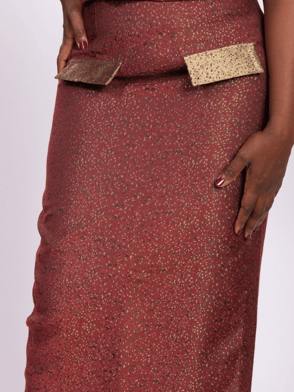 Top crop satiné et jupe taille haute à détails contrastés.
